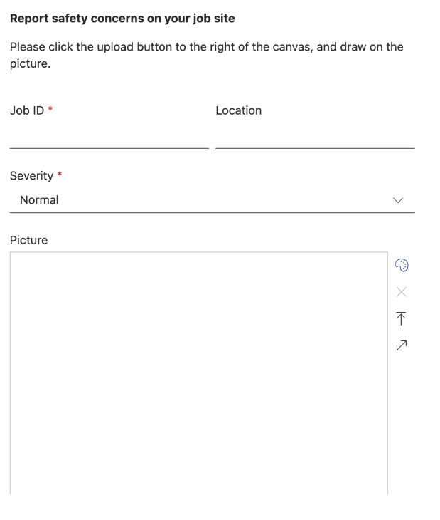 The Job Safety Template addresses these challenges through a mobile-optimized design that captures everything safety managers need to assess and respond to workplace hazards. The template includes structured fields for Job ID to link incidents directly to specific projects or work orders, Severity Level categorization for proper prioritization, Location details to pinpoint exactly where hazards exist, and comprehensive incident descriptions. What distinguishes this template from generic alternatives is the canvas markup control, which allows workers to upload photos directly from their mobile device and annotate images with arrows, circles, and text to highlight specific hazards. This visual context proves invaluable when a worker spots something like exposed electrical wiring or unstable scaffolding, where words alone cannot adequately convey the risk. The template also supports multiple file attachments, enabling workers to provide comprehensive evidence through additional photos, videos, or related documentation.